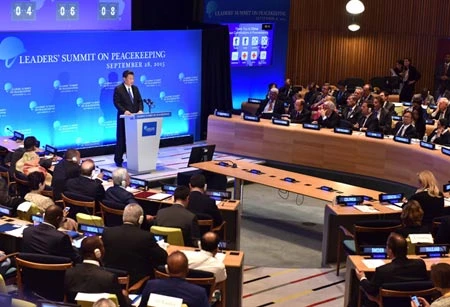 Tập Cận Bình phát biểu tại Hội nghị Thượng đỉnh về bảo vệ hòa bình tại LHQ ở New York hôm 28-9. (Ảnh: Tân Hoa xã)