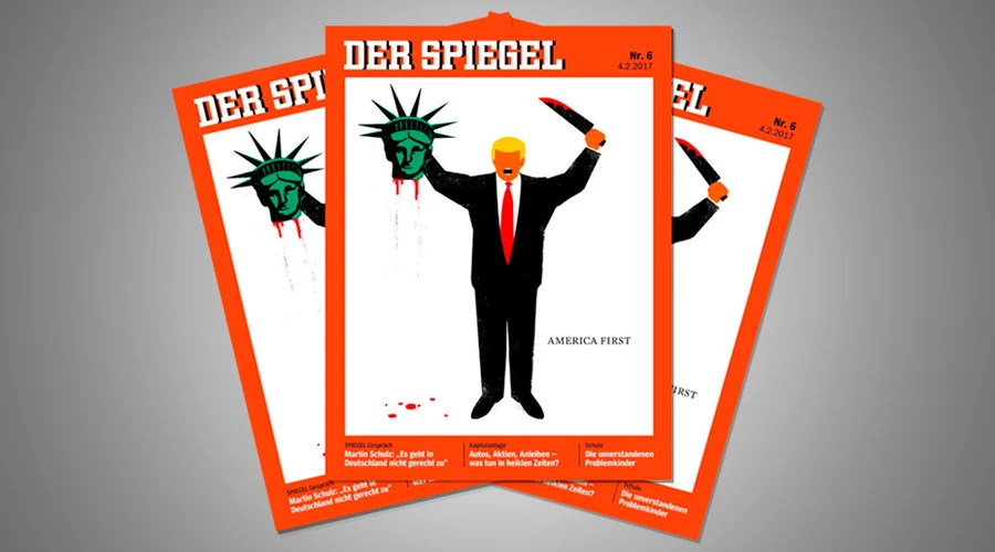Phát hành ngày 4-2, trang bìa tạp chí Der Spiegel là hình vẽ tổng thống nước Mỹ một tay cầm con dao dính máu, một tay giơ cao đầu tượng thần Tự do. Chú thích trên ảnh đề: “America First” (Nước Mỹ là trên hết - slogan tranh cử của ông Trump).