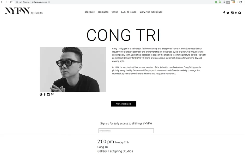 Show diễn của NTK Công Trí sẽ diễn ra vào lúc 2h chiều ngày 11-2 giờ của Mỹ tại Vanue Spring studios II, rơi vào lúc 2h rạng sáng ngày 12-2 giờ Việt Nam.