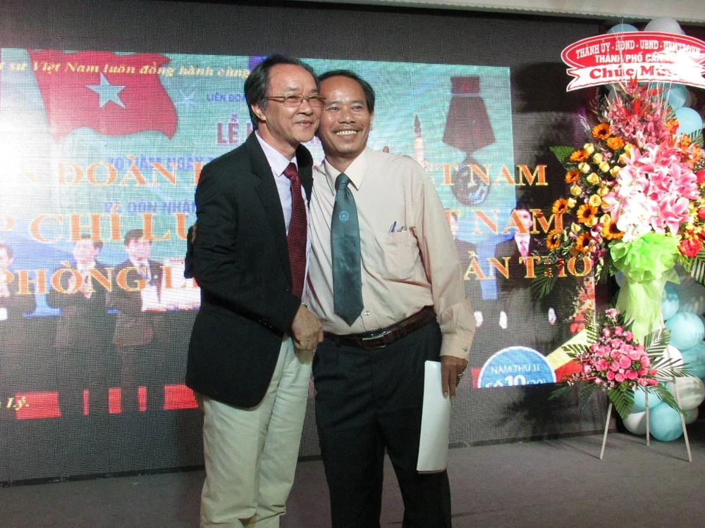 Tổng Biên tập Tạp chí Luật sư Việt Nam Nguyễn Minh Tâm (bìa trái) chúc mừng trưởng văn phòng liên lạc của tạp chí này tại Cần Thơ. Ảnh: N.NAM