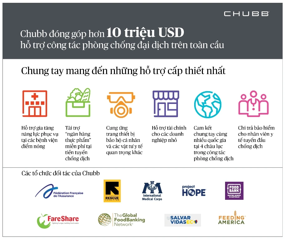 Theo thông báo mới nhất của Chủ tịch kiêm Giám đốc điều hành Tập đoàn Chubb, ông Evan Greenberg cho biết: “Chúng tôi cam kết hỗ trợ cho người dân, doanh nghiệp và cộng đồng đang chịu sự ảnh hưởng nặng nề nhất bởi cuộc khủng hoảng toàn cầu này. Con số hỗ trợ 10 triệu USD của chúng tôi nhằm góp phần bổ sung vào những nỗ lực khẩn thiết nhằm đáp ứng nhu cầu thiết yếu như dinh dưỡng và sức khỏe cho những người đang chịu ảnh hưởng nặng nề nhất từ đại dịch”.