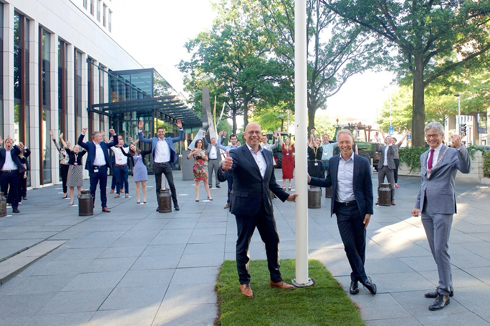 Chủ tịch Erwin Wunnekink (trái) CEO Hein Schumacher (giữa) và ông Lucas Bolsius, thị trưởng Amersfoort (phải), trong lễ kéo cờ kỷ niệm 150 năm thành lập tập đoàn FrieslandCampina.