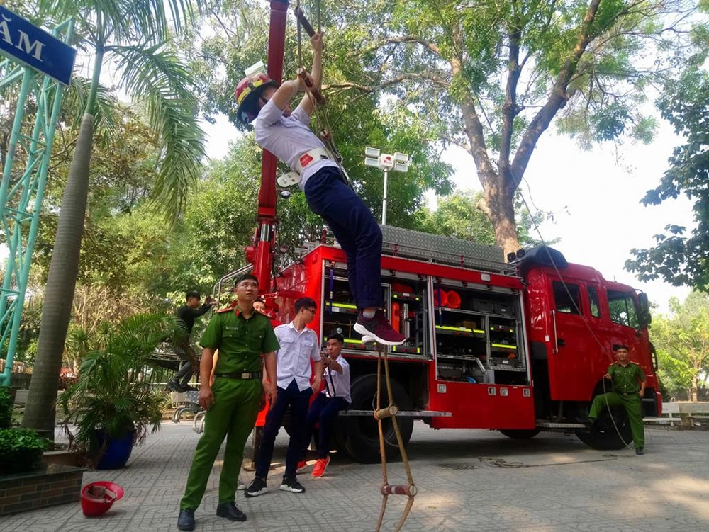 Cảnh sát PCCC Công an quận 12 tập huấn về các kỹ năng thoát hiểm, phòng cháy cho các em học sinh trên địa bàn. Ảnh HT.