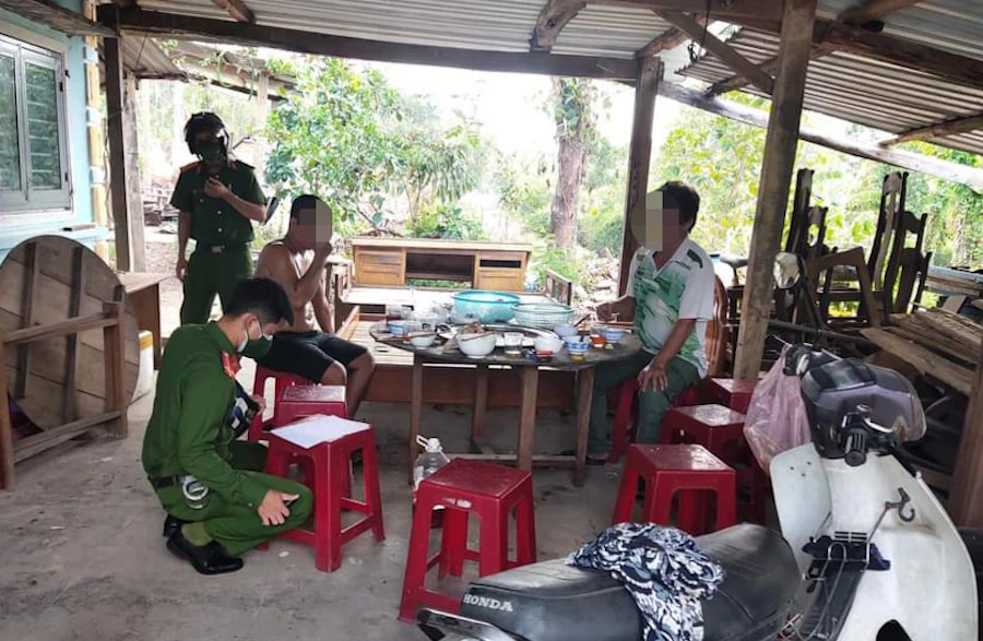 Tám người tập trung ăn nhậu giữa lúc thị trấn Tân An đang thực hiện giãn cách xã hội theo Chỉ thị 16. Ảnh: CA