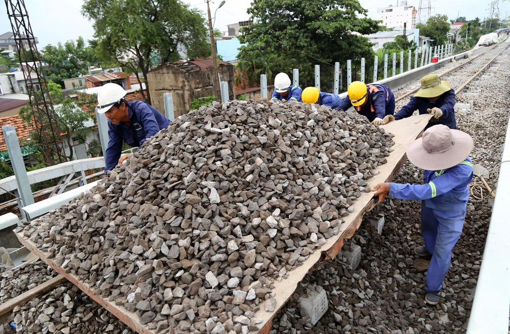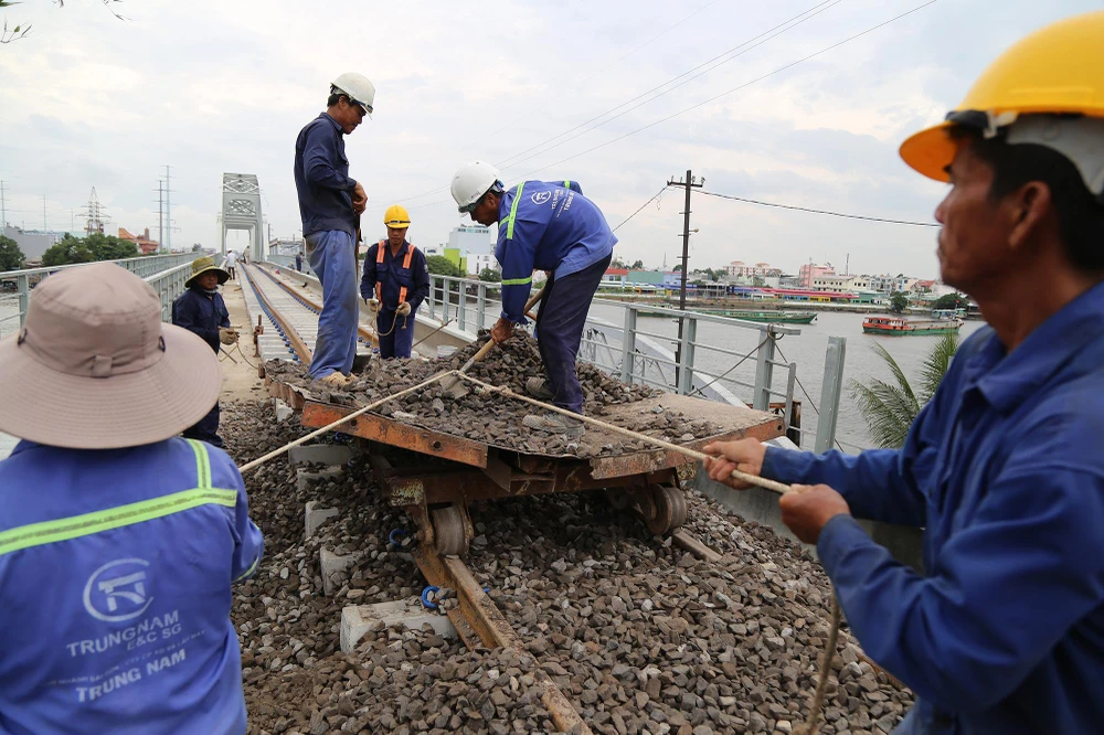 Nhóm công nhân đang rải đá để giữ cố định đoạn đường ray đã được lắp đặt.