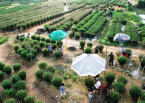 Những phụ nữ trên đồng cúc. Công việc dặm hoa, chỉnh sửa chậu hoa đòi hỏi sự khéo léo, tỉ mẩn, rất hợp với chị em. Vườn cúc vào vụ Tết là thời điểm mà các nhà vườn thuê lượng lớn nhân công làm việc theo ngày.