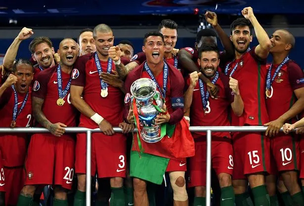 Ronaldo nâng cao chiếc cúp Euro 2016 với tư cách đội trưởng tuyển Bồ Đào Nha. ẢNH: MIRROR