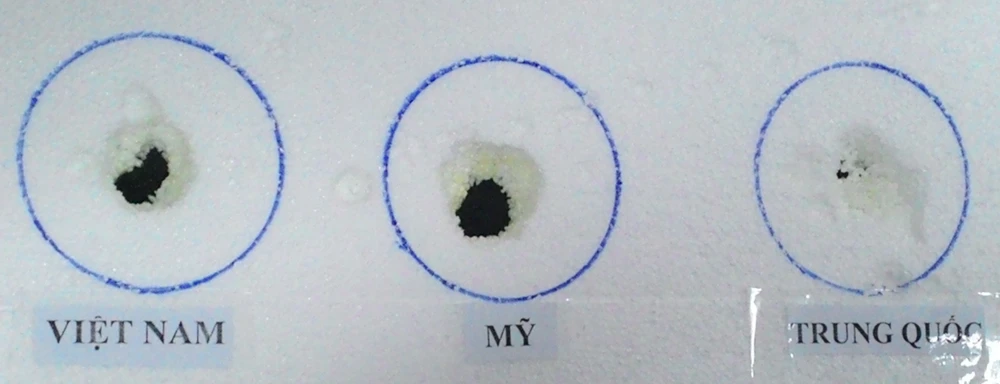 Kết quả thực nghiệm các loại dầu cá trên tấm xốp. Dầu cá của Trung Quốc ít bị ăn mòn nhất. Ảnh: ĐỨC MINH