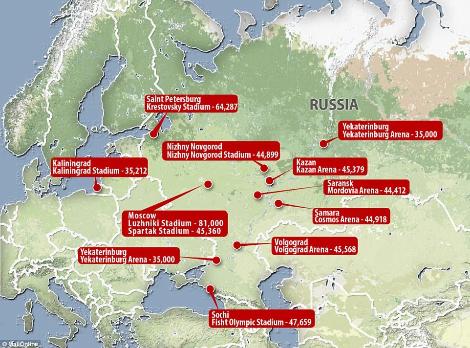 Sơ đồ 12 sân bóng tổ chức World Cup 2018.