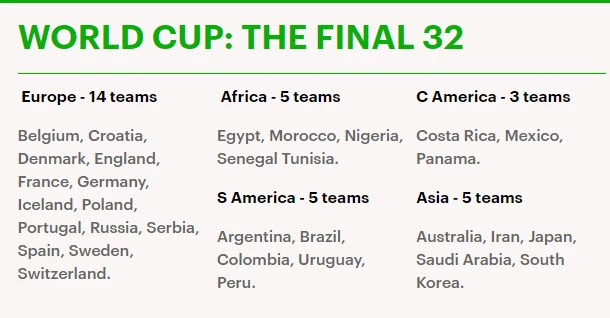 VCK World Cup 2018 đã gọi tên 32 đội tuyển xuất sắc nhất đến từ các khu vực. Châu Âu có 14 đội bao gồm chủ nhà Nga, Bỉ, Croatia, Đan Mạch, Anh, Pháp, Đức, Iceland, Ba Lan, Bồ Đào Nha, Serbia, Tây Ban Nha, Thụy Điển và Thụy Sĩ.