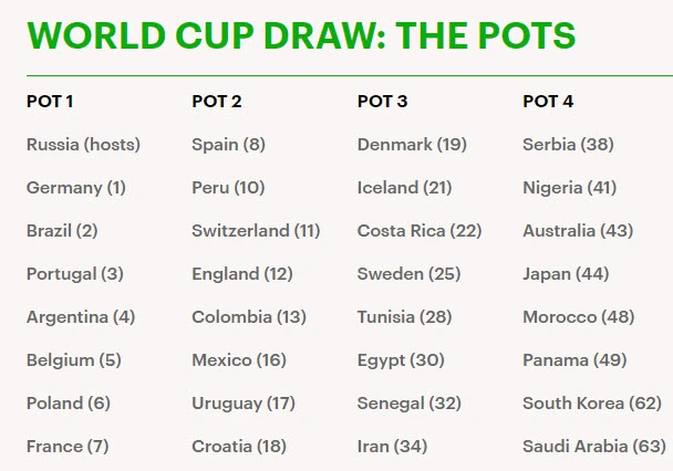 Nhóm 1: Nga (chủ nhà), Đức (vị trí trên BXH FIFA là số 1), Brazil (2), Bồ Đào Nha (3), Argentina (4), Bỉ (5), Ba Lan (6), Pháp (7).