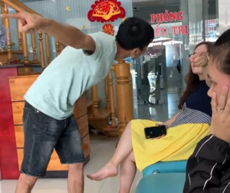 Chồng của khách hàng bị chủ cơ sở Nha khoa Khánh Kiều đánh đã tới yêu cầu làm rõ sự việc. Ảnh cắt từ clip.