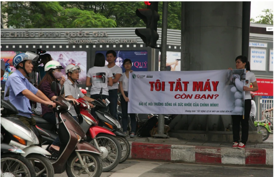 Các bạn sinh viên đang kêu gọi người đi xe máy tắt máy xe khi dừng đèn đỏ quá 20 giây.