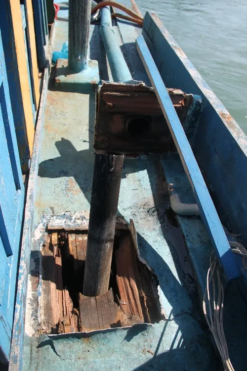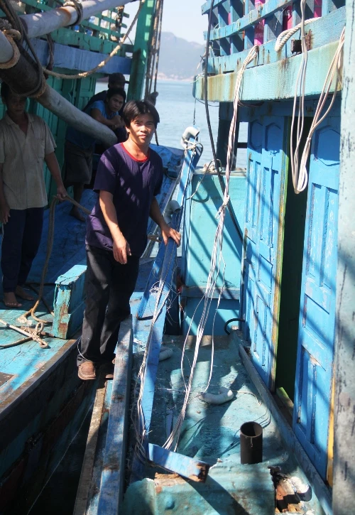 Tàu cá BĐ- 96496 TS bị hư hỏng nặng sau khi bị tàu Trung Quốc tấn công. Ảnh: TRỌNG LỢI