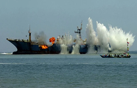 Một tàu cá bất hợp pháp bị hải quân Indonesia đánh chìm. Ảnh: REUTERS