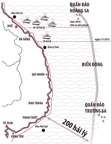Lược đồ các tàu cá nước ngoài xâm phạm vùng biển Việt Nam đánh bắt trộm. Đồ họa: KD