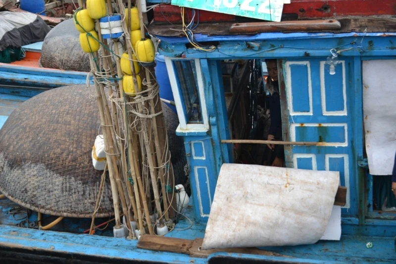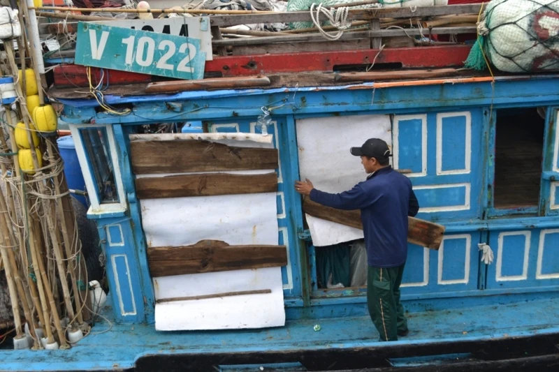 Ngư dân che chắn, vá víu lại tàu để ra khơi cho kịp chuyến tết.