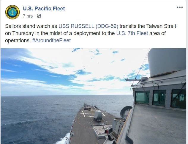 Trang Facebook của Hạm đội Thái Bình Dương của Mỹ thông báo về việc tàu khu trục USS Rusell đi qua eo biển Đài Loan. Ảnh: FACEBOOK