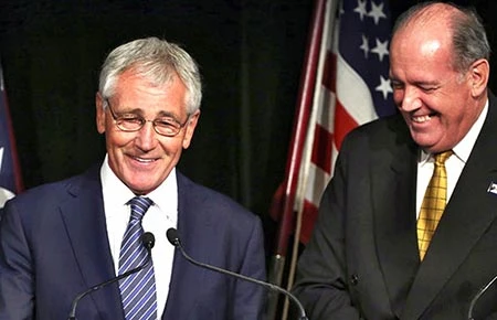 Bộ trưởng Quốc phòng Mỹ Chuck Hagel (trái) và người đồng cấp Úc David Johnston tại Sydney ngày 11-8. Ảnh: GETTY IMAGES