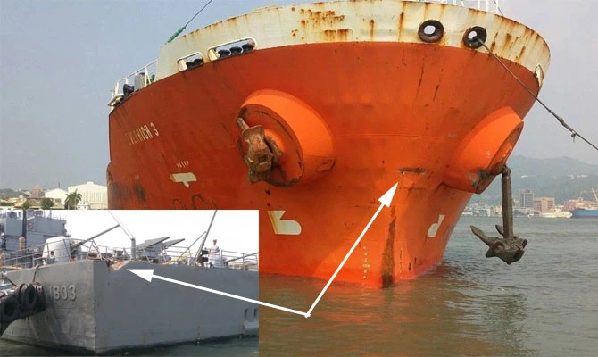 Hai tàu bị hư hỏng nhẹ sau vụ va chạm giữa tàu chở dầu Việt Nam Everrich 3 (cam) và tàu khu trục Đài Loan ROCS Tso Ying. Ảnh: FleetMon