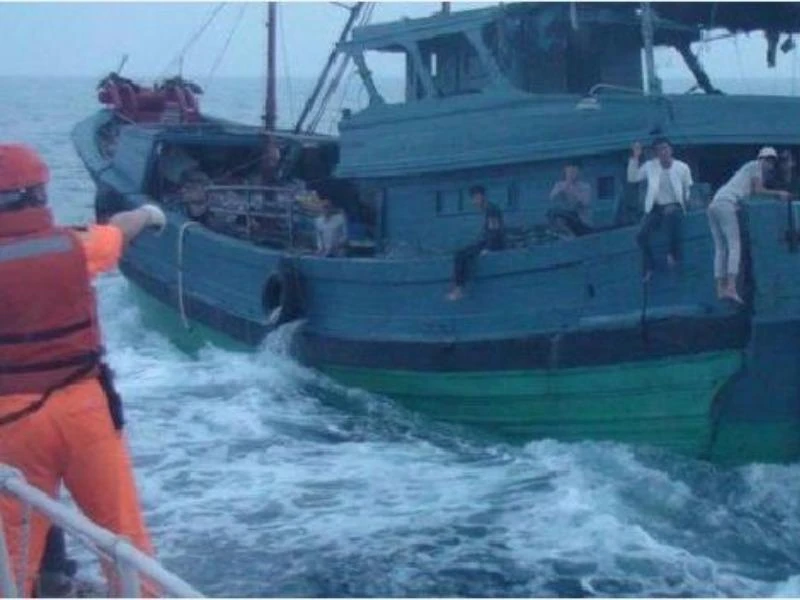 Tàu tuần tra Đài Loan yêu cầu các thuyền viên tàu Nanao 31049 dừng lại để kiểm tra. Ảnh: HẢI CẢNH BÀNH HỒ