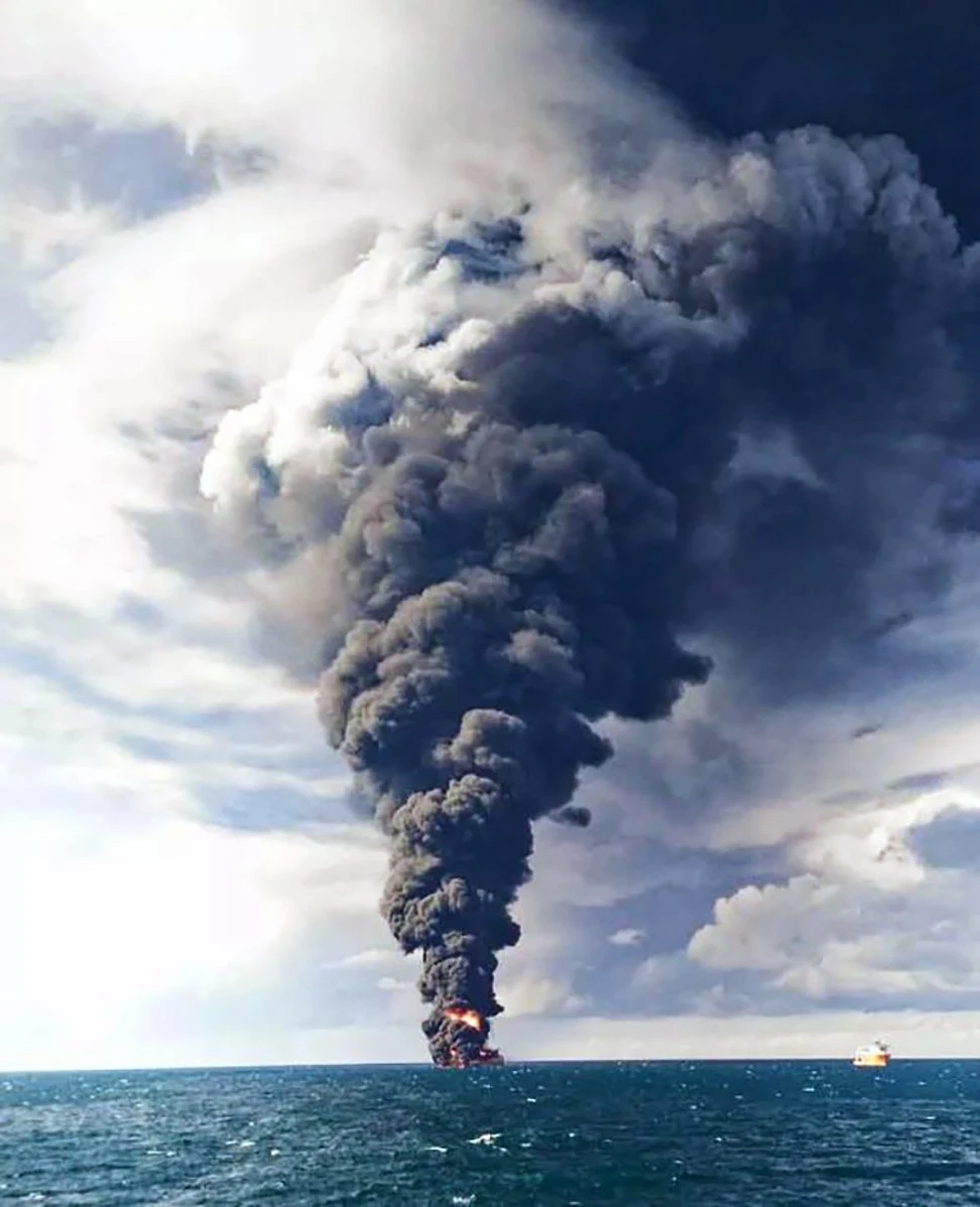 Tàu Sanchi phát nổ và cột khói bốc lên cao tới 3 km. Ảnh: SCMP
