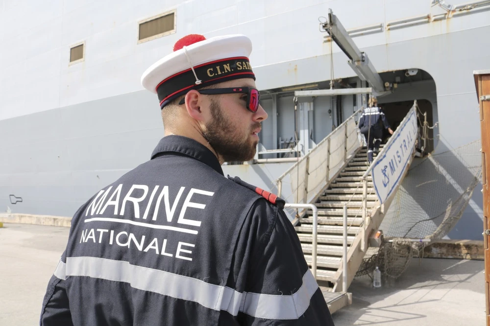 Tàu Mistral rời Pháp hồi tháng 2, có thể chở tới 35 trực thăng và 4 tàu đổ bộ, cũng như hàng trăm binh sĩ. Tàu đã thăm Nhật trong tháng này trước khi tới Guam.