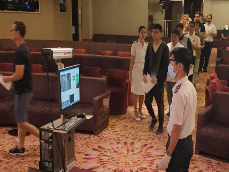 Trung tâm Kiểm dịch y tế quốc tế TP.HCM phối hợp đội ngũ y bác sĩ trên tàu thực hiện kiểm tra sức khỏe, đo thân nhiệt cho du khách, thủy thủ đoàn và ghi nhận tất cả không có dấu hiệu bệnh COVID-19.