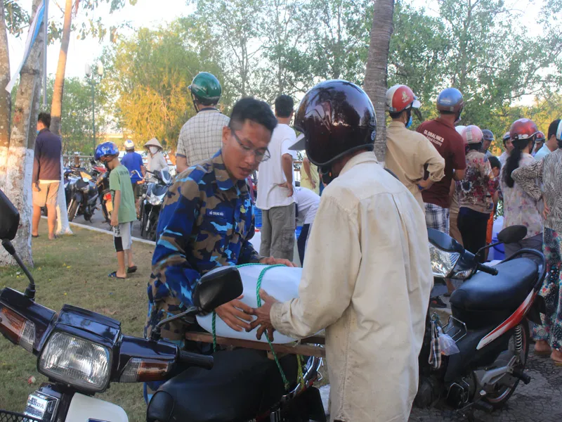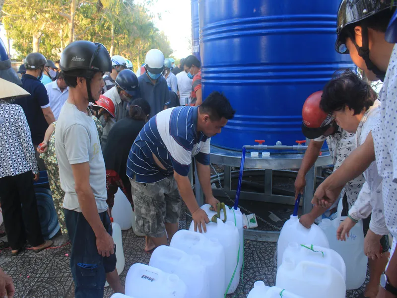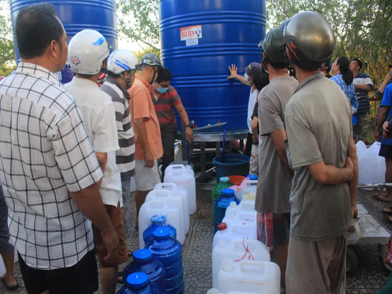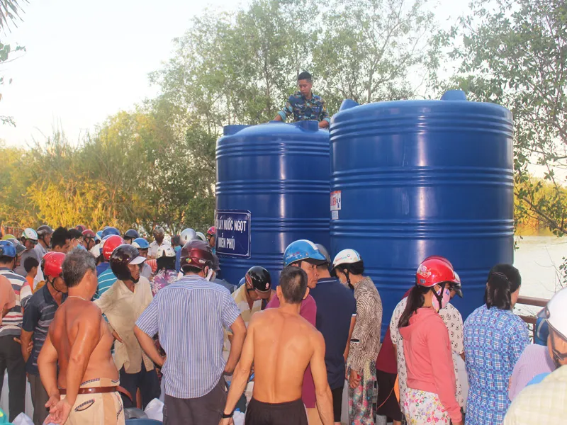 Khi tàu cập bến bờ sông Hàm Luông (khu vực phường 7, TP Bến Tre), nguồn nước ngọt được bơm từ tàu lên hai bồn chứa được trang bị sẵn để người dân thay phiên nhau đến lấy nước ngọt. Hàng trăm người dân TP Bến Tre phải xếp hàng từ chiều đến tối để chia nhau từng can, thùng nước ngọt hiếm hoi.