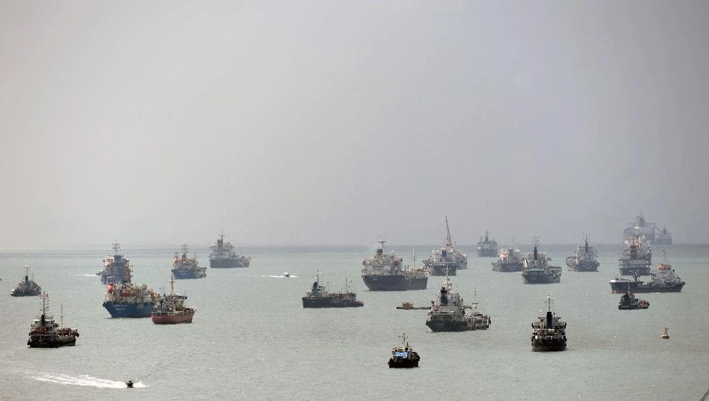 Các tàu di chuyển qua eo biển Singapore. Ảnh: AFP