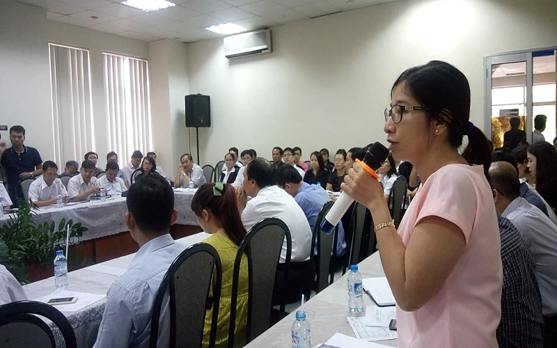 Đại diện Tổng Công ty Tân Cảng Sài Gòn thông tin tại buổi làm việc với Cục Hàng hải Việt Nam, Cục Xuất nhập khẩu (Bộ Công Thương), các chủ hàng, doanh nghiệp (DN) và văn phòng hãng tàu Hanjin Việt Nam tại TP.HCM ngày 23-9.