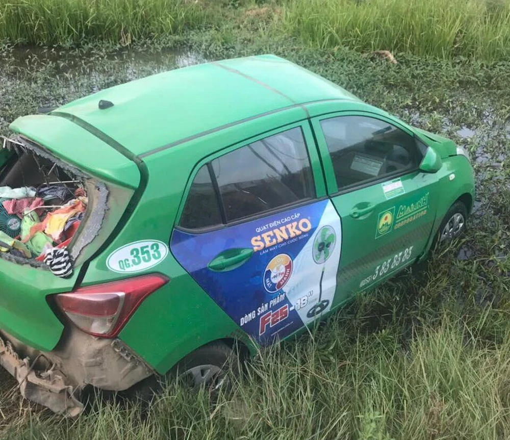 Chiếc xe taxi bị đâm bay xuống ruộng nước. Ảnh: HOÀI AN.