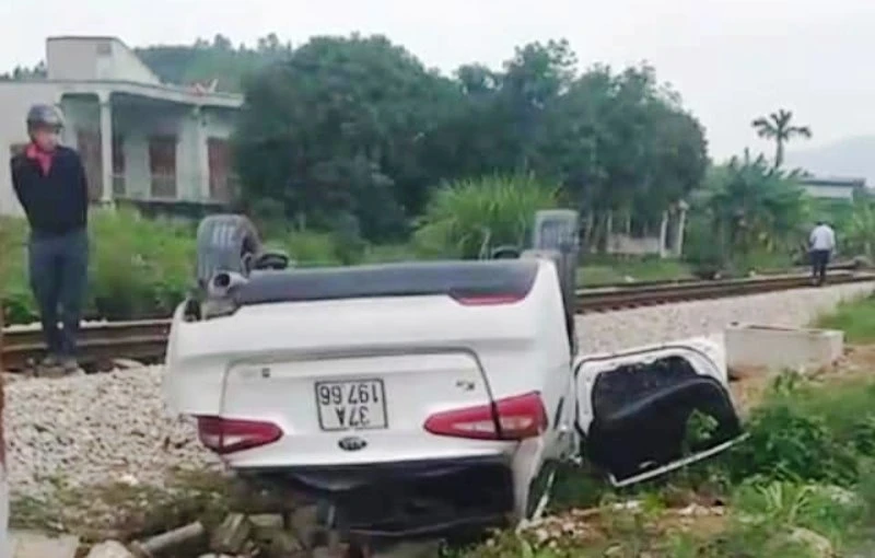 Chiếc ô tô bị tàu hỏa đâm lật ngửa bên đường sắt Bắc-Nam, người phụ nữ điều khiển ô tô bị tử vong.