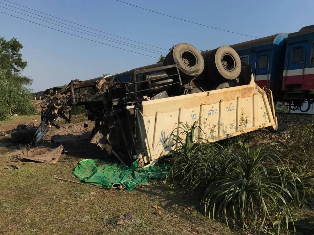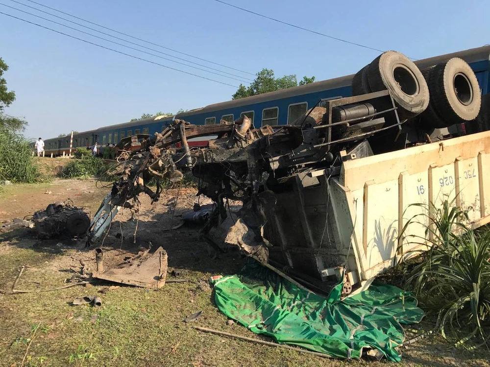 Tàu SE2 đâm nát ô tô tải. Ảnh: H.Hoàng