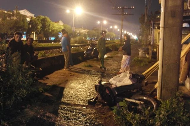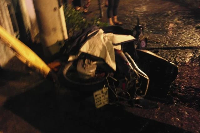 Hiện trường vụ tai nạn, chiếc xe máy bị hư hỏng nặng.