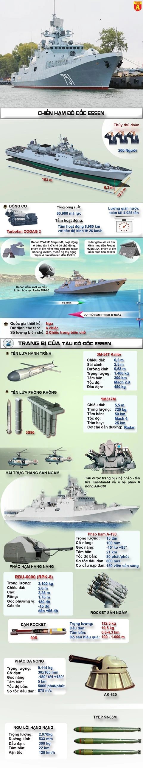 Khu trục đô đốc Essen của hạm đội Biển Đen Nga được trang bị kho vũ khí khủng khiếp, ngoài hệ thống phòng không có thể bắn cháy bất cứ mục tiêu bay nào từ tên lửa hành trình tới máy bay chiến đấu. Ngoài ra vũ khí chống ngầm trên chiến hạm có thể triệt hạ các tàu ngầm kể cả tàu ngầm nguyên tử.