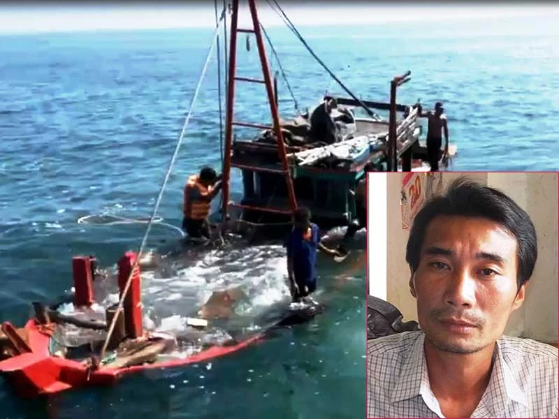 Tàu ngư dân bị chìm xuống biển sau cú va chạm với tàu TH-0002/KN. Ảnh: Đ.TRUNG (cắt ra từ clip). Ảnh nhỏ: Ngư dân Dương Văn Đồng đang tường thuật lại sự vụ. Ảnh: LÊ DƯƠNG