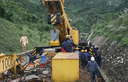 Cơ quan chức năng cứu hộ một tàu chở hàng bị lật tại khu vực đèo Hải Vân vào ngày 21-1-2011. Ảnh: LÊ PHI