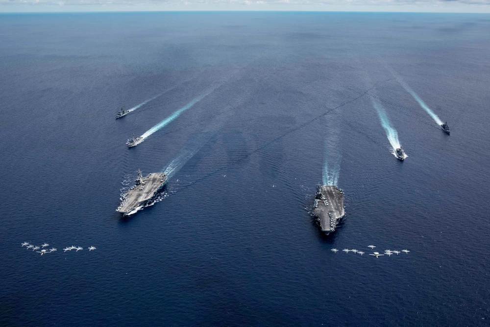 Hai tàu sân bay Mỹ USS Ronald Reagan và USS Nimitz cùng một số khu trục hạm hộ tống tập trận ở Biển Đông hồi tháng 7. Ảnh: REUTERS