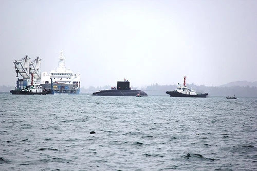 Tàu ngầm HQ-183 đang được lai dắt vào quân cảng Cam Ranh sau khi rời khỏi tàu mẹ Rolldock Star