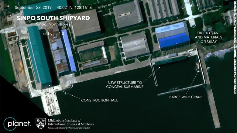 Những hình ảnh từ Viện nghiên cứu quốc tế Middlebury và công ty vệ tinh Planet Labs cho thấy Triều Tiên đang chuẩn bị công đoạn phóng tàu ngầm tại nhà máy đóng tàu hải quân Nam Sinpo dọc theo bờ biển miền Trung của nước này.