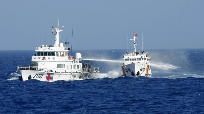 Tàu hải cảnh Trung Quốc 21101 tấn công tàu kiểm ngư Việt Nam 768 bằng vòi rồng - Ảnh: Tuổi Trẻ