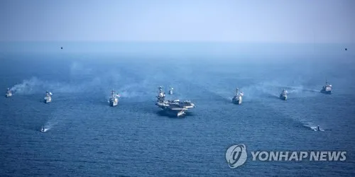 Tàu sân bay USS Carl Vinson của hải quân Mỹ tiến hành tập trận chung với các tàu chiến Hàn Quốc. Ảnh: Yonhap