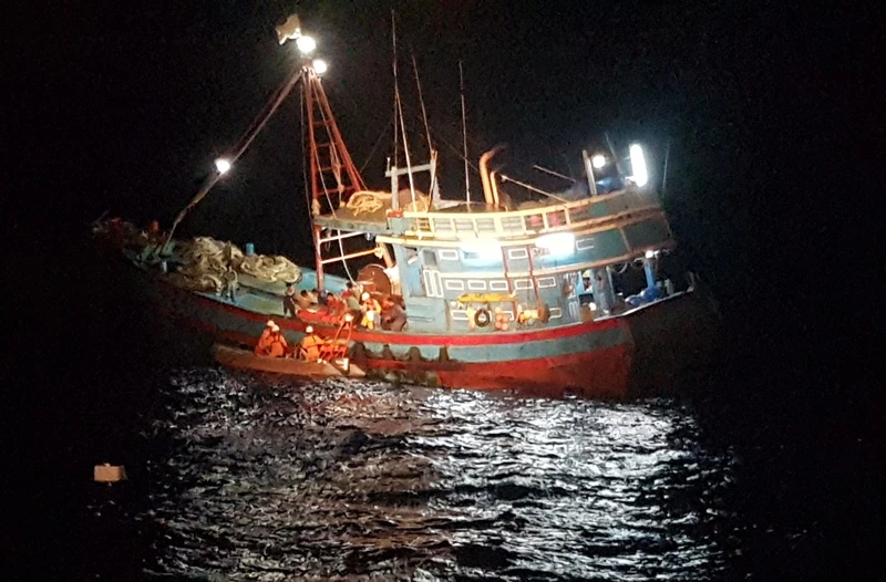Lực lượng cứu nạn hàng hải dùng xuồng máy tiếp cận tàu cá trong đêm. Ảnh: Danang MRCC