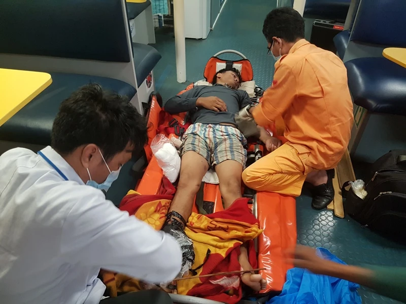 Các bác sĩ nhanh chóng cấp cứu tại chỗ để xử lý vết thương, đưa nạn nhân lên tàu SAR 412 để tiếp tục được chăm sóc tích cực và khẩn trương đưa về đất liền.