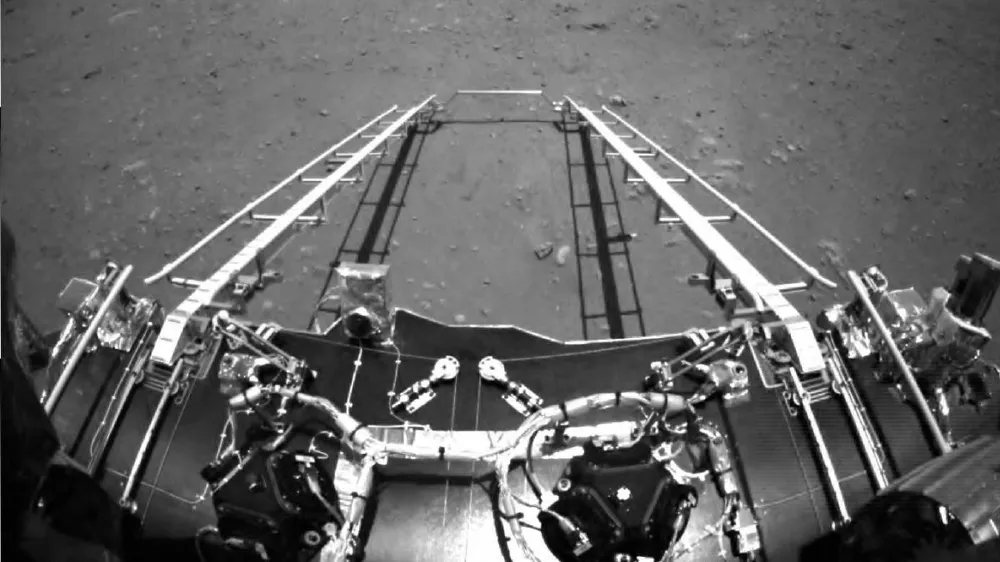 Cục Hàng không vũ trụ quốc gia Trung Quốc (CNSA) hôm 19-5 đã công bố những hình ảnh đầu tiên được camera gắn trên tàu thăm dò Chúc Dung chụp lại, cho thấy một số kết cấu trên robot tự hành này như thiết bị tránh chướng ngại vật và các tấm pin mặt trời, cùng với một số hình ảnh về kết cấu bề mặt sao Hỏa.