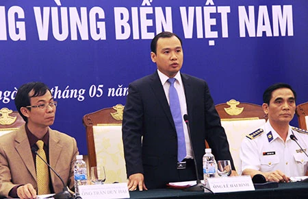 Quyền Vụ trưởng Vụ Thông tin Báo chí Bộ Ngoại giao Lê Hải Bình thông tin về quá trình đấu tranh ngoại giao của VN với hành động xâm phạm của TQ. Ảnh: VIẾT THỊNH