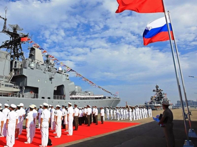 Ảnh công bố ngày 12-9-2016 cho thấy các sĩ quan và thủy thủ của quân đội Trung Quốc tham gia lễ đón một tàu chiến Nga tới thăm cảng ở TP Trạm Giang, tỉnh Quảng Đông. Ảnh: TÂN HOA XÃ