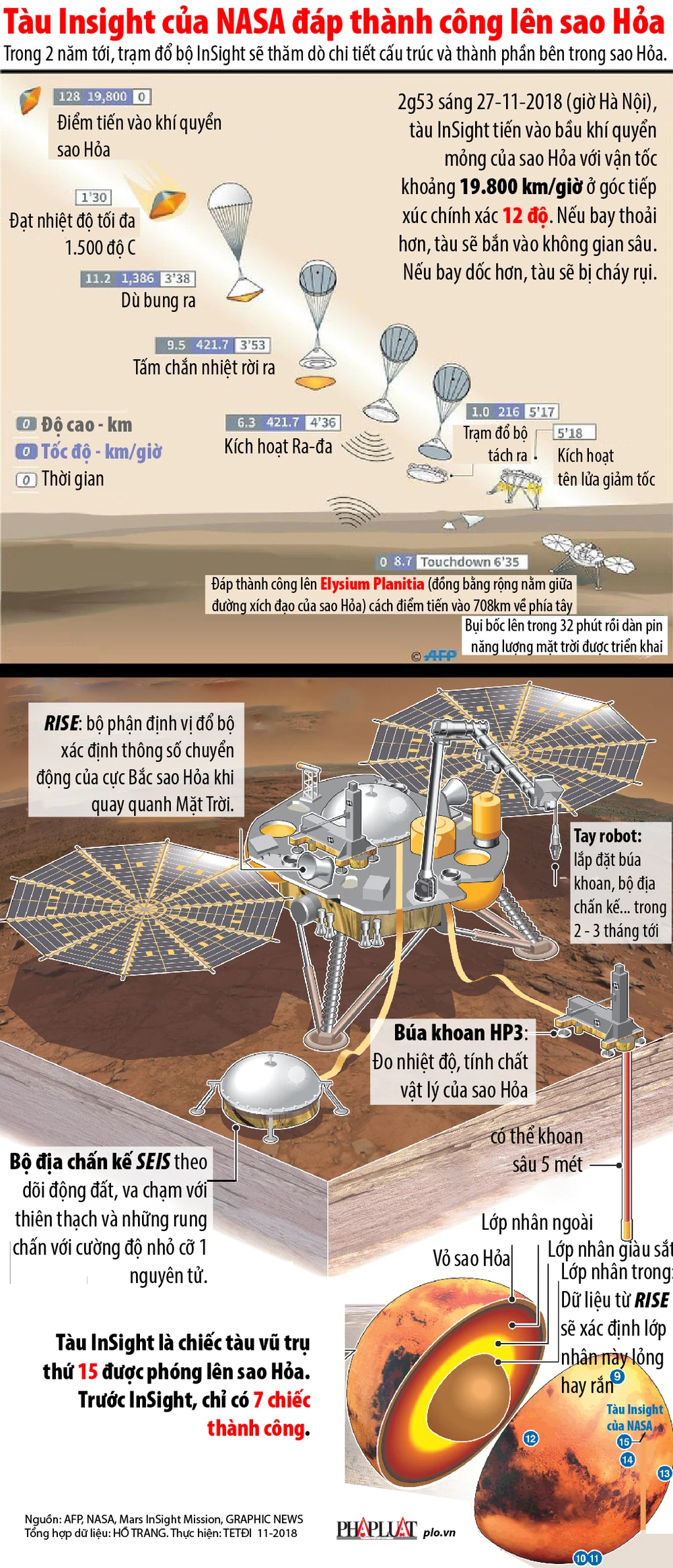 (PLO)- Gần 3 giờ sáng 27-11-2018 (giờ Hà Nội), tàu Insight trị giá 850 triệu USD của NASA đổ bộ thành công xuống bề mặt hành tinh đỏ với vận tốc khoảng 19.800 km/giờ ở góc tiếp xúc chính xác 12 độ.