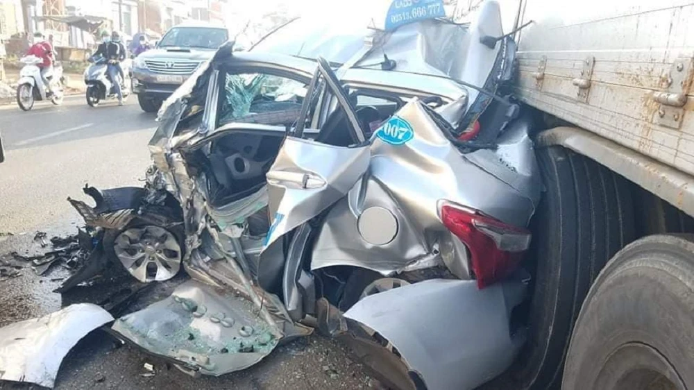 Taxi bị đẩy sang làn đường đối diện đúng lúc xe tải 85C-028.51 lao tới. Chiếc taxi bị cuốn vào gầm, bẹp dúm toàn bộ phần phía sau.